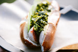 Order the special menu item: Bratwurst in a Pretzel Bun, perfectly complemented by a smear of spicy house-made mustard and a bright, crunchy topping of pickled kohlrabi, all harvested fresh from the Organic Clif Family Farm.